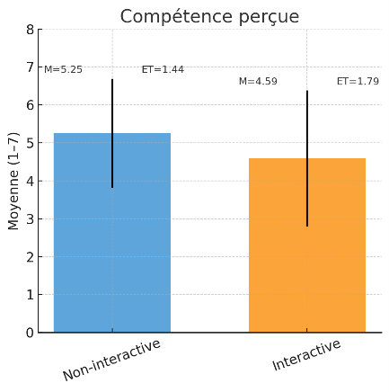 Les résultats montrent des contrastes intéressants : les salles interactives sont jugées plus chaleureuses, mais les salles non interactives apparaissent plus compétentes et, au final, génèrent davantage de satisfaction. Dans ce qui suit, les résultats sont présentés avec la moyenne (M) et l’écart-type (ET) afin de rendre compte à la fois du niveau général et de la dispersion des réponses. Sur la chaleur perçue, l’avantage est net pour la salle interactive (M = 4,72 ; ET = 1,65) comparée à la salle non interactive (M = 3,72 ; ET = 1,80). Les participants décrivent l’ambiance comme plus amicale et accueillante lorsque l’espace favorise les échanges. Pour la compétence, c’est l’inverse : la salle non interactive est évaluée plus positivement (M = 5,25 ; ET = 1,44) que la salle interactive (M = 4,59 ; ET = 1,79). L’agencement sobre et distant semble donc envoyer un signal de sérieux et de professionnalisme. Enfin, la satisfaction globale est également plus forte pour la salle non interactive (M = 5,20 ; ET = 1,62) que pour la salle interactive (M = 4,37 ; ET = 1,77). L’intimité et le calme semblent peser davantage que la convivialité lorsqu’il s’agit de se projeter dans un contexte médical