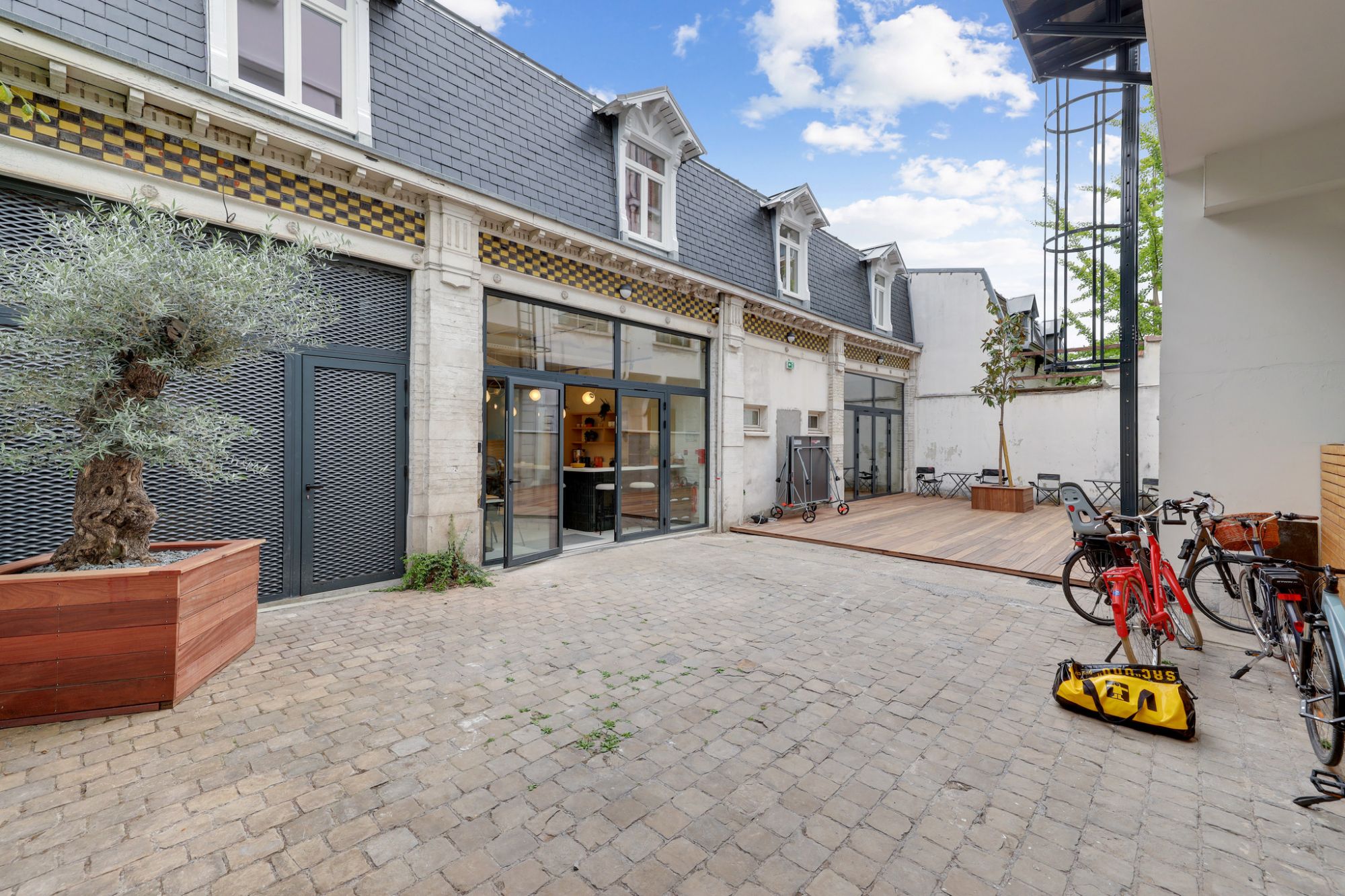 Afin de profiter de la cour, une terrasse en bois exotique a été aménagée. Les 2 bâtiments ont été mis en conformité pour accueillir un effectif de 90 personnes, sur une surface globale de 790m².